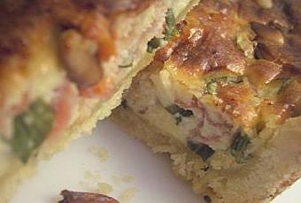 * Sortir la pâte du four et y verser la préparation en ayant soin de bien répartir la roquette, jambon et les tomates confites sur l'ensemble de la tarte.