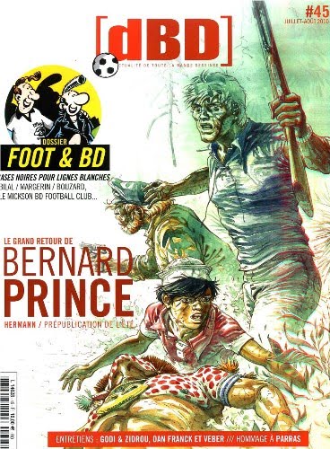 Le numéro double de juillet-août 2010 de [dBD] s’intéresse évidemment au football, coupe du monde oblige ! Mais comme chaque année il propose plusieurs avant-premières à commencer par le retour de Bernard Prince par Hermann et cette fois son fils au scénario et donc la prépublication de la première partie du T.18 à paraître à la rentrée. Ce numéro de 128 pages est vendu 10,00 € et ne contient pas les sorties du mois, mais toujours quelques belles interviews et des critiques.Une nouvelle fois, Henri Filippini propose un dossier sur l’histoire thématique de la BD. Contrairement au cyclisme ou à la boxe, le football, premier sport populaire européen a eu un traitement plutôt secondaire dans la BD franco-belge avec des débuts timides. Le journal Tintin a consacré un espace élargi au sport, notamment au foot avec Raymond Reding. Les années 70, de petites maisons d’édition publient de nombreuses pages réalistes sur le foot et le mouvement se développe dans toute l’Europe. Si le foot n’a pas eu de grande série emblématique, les séries classiques ont invité ce sport comme Spirou & Fantasio ou Boule & Bill. Plus récemment, Emmanuel Proust a démarré avec Carton Jaune de Didier Daeninckx et Bamboo a lancé sa série humoristique Footmaniacs. Enfin le dossier se complète d’un éclairage sur le Mickson BD Football club, l’équipe de foot d’auteurs de BD comme Enki Bilal, André Juillard, Jean-Claude Mézières ou Frank Margerin, son capitaine, qui offre une histoire courte de 10 planches sur Lucien et le foot! S’ajoutent une interview de Guillaume Bouzard sur la série Football, Football (Dargaud), un regard croisé d’Enki Bilal et Patrick Cauvin sur leur album de 1987, Hors Jeu. Un petit regret : ne pas nous avoir fait découvrir le nouvel album Fais péter les basses, Bruno ! de Baru à paraître chez Futuropolis. Signalons enfin un amusant édito en image de Vuillemin sur BD et Foot.