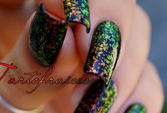 J'ai enfin pu trouver quelqu'un pour me fournir ce vernis !!! Il est trop trop beau, c'est un vernis transparent avec plein de petits "flakies" (flocons, morceaux, chips) à l'intérieur aux reflets du drapeau du Mali lol vert, jaune, rouge. Il prend toute sa splendeur sur un vernis foncé, le must étant le noir. Sur un vernis clair il fait quelques reflets mais sans plus. Texture idéeale, 1 couche par dessus du noir.