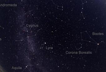 Au cours de l’été, tout autour du sommet du ciel, on peut voir trois étoiles très brillantes déjà évoquées ci-dessus : Véga, Deneb et Altaïr. La première appartient à la constellation de la Lyre (Lyrae), elle se situe à 25 années-lumière de nous. Une légende raconte que l’instrument de musique a été créée à partir d’une carapace de tortue par le dieu Hermès. En l’observant attentivement, on peut remarquer que la constellation imite parfaitement un parallélogramme auquel s’ajoute la lumineuse Véga (alpha lyrae).