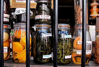 Voilà une belle enseigne typiquement parisienne des Grands-Boulevards, bien franchouillarde sur les plats et de par l'accueil de Gérard, le patron. Car impossible de passer la porte (verrouillée) sans découvrir la petite histoire de ce restaurant, qu'il raconte avec délectation : le nom des Deux Canards lui vient de la seconde guerre mondiale, à l'époque une imprimerie, au service de Vichy en journée, et clandestine la nuit. D'où la porte fermée de jour par précaution, tradition encore en place aujourd'hui. Une fois rentrés, Gérard nous présente, bocaux après bocaux, le secret de fabrication des oranges confites et leurs différents stades de maturation, le vin de noix, préparé avec soin, et les recettes plus originales les unes que les autres (réalisées par Catherine, la maman), et qui font toute la spécificité de ce restaurant. Attention âmes sensibles, il faut avoir un solide appétit et aimer la bouteille pour apprécier ce moment à sa juste valeur, même à l'heure du déjeuner. Inutile de prévoir une après-midi sur-chargée, seule la sieste vous parlera. Nous commençons par goûter les vins de noix et d'orange, en attendant les entrées : petits sépias poêlés à l'huile d'olive, et os à la moelle au gros sel. Un régal. Viennent ensuite les plats, j'ai déjà testé un bourguignon de canard au miel d'orange - confite of course, et les aiguillettes de canard au café, très curieux, intéressant mais pas mon préféré, ça reste très amer et surtout trop fort de café comme on dit ;) Viennent ensuite la farandole de fromages, du munster accompagné de graines de carvi et de zestes d'oranges, environ 5/6 boîtes plus ou moins avancées, de quoi ravir les amateurs, et refouller les collègues l'après-midi. Tout ceci accompagné de bouteilles de Coteaux du Languedoc Mas du Novi. On en ressort repus, le sourire aux lèvres.Les Deux Canards, 8 rue du Faubourg Poissonnière dans le 9e