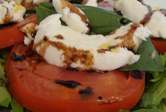 4. Assaisonnez avec un filet d'huile d'olive au basilic et de vinaigre balsamique. Salez et poivrez