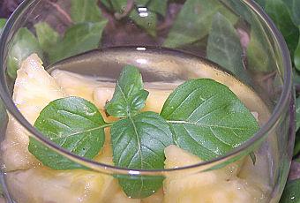 Mettre les morceaux d'ananas dans un saladier et versez dessus le sirop de basilic.(avec le basilic)