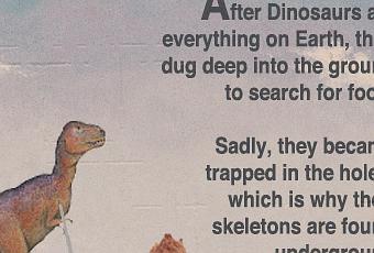 « Comment les dinosaures ont disparu ? Et bien après qu’ils aient mangé tout ce qu’il y avait sur Terre, il cherchèrent de la nourriture en creusant profondément. Malheureusement, il furent piégés dans les trous qu’ils avaient creusé, ce qui explique pourquoi l’on retrouve maintenant leurs squelettes sous terre.«