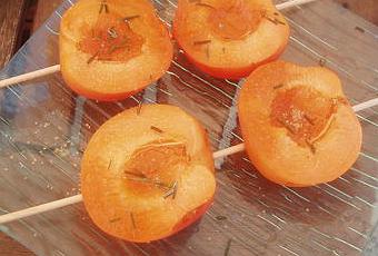 Séparer les oreillons de vos abricots, enlever le noyau, les piquer sur une brochette, saupoudrer de sucre, ajouter y quelques brins de romarin. Et mettre à cuire 5-10 minutes selon l'intensité de votre barbecue, sur la grille, en les retournant de temps en temps.