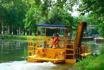 De moins en moins de bateaux circulent sur le canal, plus rien ne vient lutter contre la prolifération des végétaux qui, peu à peu, recouvrent l’eau. Un engin est désormais chargé d’assurer la récolte de ces plantes, de les déposer sur la berge, et de recommencer : c’est le faucardage.