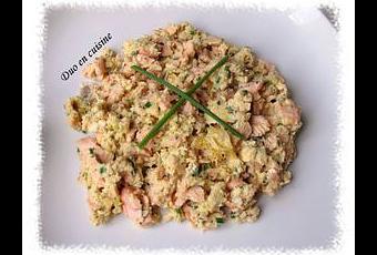 Découper le saumon en gros dés et l’ajouter dans le saladier.