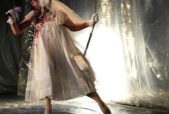 Une grande fille en robe blanche, un voile en dentelles sur la tête, court, folle de colère sur la scène et raconte dans une boucle sans fin l’histoire du roi qui a mangé toute sa famille, y compris ses enfants, pour ne pas être renversé. En accompagnement une coulisse sonore électronique où les basses prédominent. C’est presque comme si on se trouvait à l’intérieur d’un pétrolier géant.