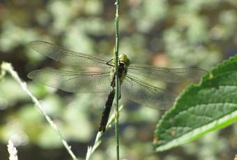 Ci-dessous cette libellule est certainement une aeschne, famille regroupant les plus grosses libellules. Ces insectes sont verts, bleus ou brun foncé, avec des rayures sur le thorax et des taches ou des bandes sur l’abdomen. Les très gros yeux se rejoignent au sommet de la tête. Les quatre ailes sont transparentes ou ambrées. L’extrémité abdominale porte deux appendices en pince et chez le mâle un troisième appendice plus petit entre les deux. Leur taille varie entre 60 et 140mm.