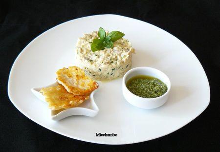 Il faut 4 cercles de taille 75. Mouler le tartare jusqu'à hauteur. Dresser un cordon de sauce au pistou autour du cercle de tartare et accompagner d'une tuile de parmesan.