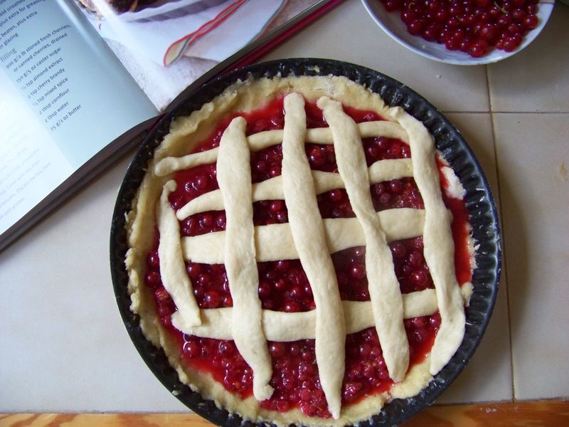 Avec le reste de pâte, faire des bandes que l'on placera au dessus de la tarte. Cuire pendant 30 min jusqu'à ce qu'elle dore.