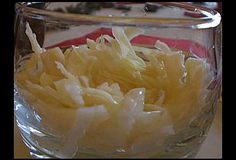 1) Détaillez votre chou en fines lanières. Mettez le à tremper dans de l'eau froide pendant environ 20 minutes, puis égouttez le.