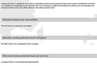 L'équipe de France.fr regrette de ne pouvoir vous permettre de retrouver le portail de la France. Nous sommes actuellement confrontés à un problème de configuration de nos serveurs. Nous avons entrepris un audit de l'ensemble des systèmes pour nous permettre une réouverture dans les plus brefs délais. Merci de votre patience et à très vite !