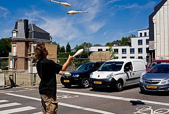 ... et demandait une pièce aux automobilistes en attente. Son timing était parfait: en moins d'une minute chrono, il se présentait sur le passage zébré, lançait deux ou trois fois son jeu de quilles, remerciait et passait encore à deux ou trois fenêtres de voiture pour chercher un petit lot. Belle initiative d'animation de carrefour.