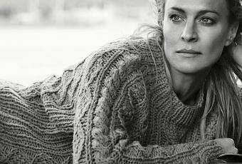 Sur cette photo, Robin Wright porte ce joli pull qu'on aimera porter au coin du feu en décembre... C'est le célèbre photographe Peter Lindbergh qui a fait cette jolie photo à Deauville.