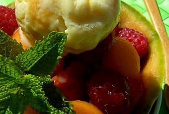 * Au moment de servir, égoutter les fruits réservés au frais et remplir harmonieusement les coques de melon avec cette salade de fruits aromatisée à l'amaretto ainsi que les framboises. Ajouter un peu de jus (à votre convenance).