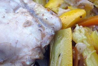 Au bout des 20 mn ajouter les légumes dans la sauteuse, saler et poivrer, couvrir et laisser mihoter 20 à 25 mn. Servir chaud.