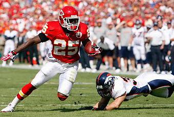 Après une fin de saison surprenante où il a amassé 968 verges dans les huit derniers matches, on se disait que Jamaal Charles avait mérité le poste de RB partant mais v’là-t’y pas que les Chiefs sont allés chercher Thomas Jones pendant la saison morte pour palier aux inquiétudes sur la capacité de Charles à devenir un workhorse. À chaque saison, on se dit que Jones est fini mais il a quand même fini la saison 2009 avec 1402 verges (sa meilleure saison à vie!), le vieux snoreau. Donc, on a beau dire qu’il sera juste là pour alléger la tâche de Charles, on a ben l’impression que les deux vont se battre pour avoir le ballon le plus souvent possible.