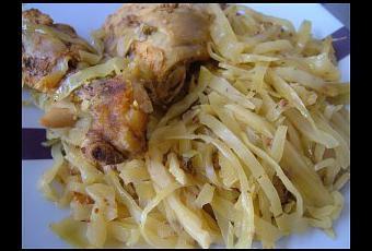 Dans une cocotte allant au four, mettre la moitié du chou blanc, puis le poulet et recouvrir avec le reste de chou. Mouillez avec la marinade et mettre au four a 200°C et laisser cuire pendant 1h