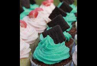 3. Décorer les cupcakes chocolat refroidis de la crème à la menthe à l'aide d'une poche à douille. Disposer 1/4 d'after-eight sur le dessus pour la déco.