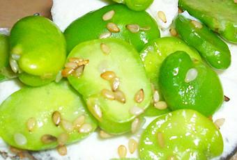 En version crostini au saint-maure frais (acheté sur un marché en Touraine, lequel m'a aussi fournie les dites fèves!), huile de noix, poivre doux blanc et graines de sésame blond!
