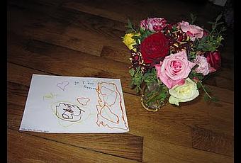 avec ce beau dessin et ce joli bouquet, j'ai même eu droit à un bisou et un maman je t'aime récité en regardant papa, j'étais trop contente alors j'ai tenté ma chance en demandant un petit câlin. Comme d'hab mr Lutin a refusé mais il m'a laissé lui en faire un. Merci Loulou !