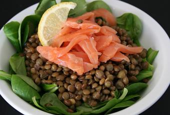 Salade de lentilles vertes citronnée au saumon fumé