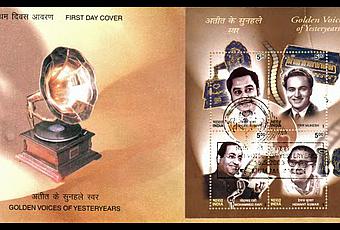 India Post a émis, le 15 mai 2003, une planche dédiée aux quatre voix masculines de l'âge d'or. Voici l'enveloppe premier jour où vous reconnaîtrez sans doute de g.à dr.: en haut, Kishore et Mukesh ; en bas, Mohd. Rafi et Hemant Kumar. Les plus beaux timbres de voix !