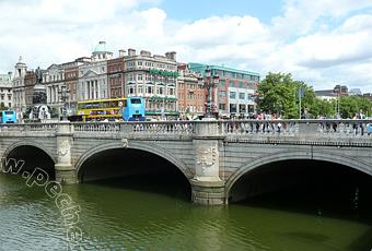 Le “Ha’Penny Bridge” est une passerelle pédestre construit en 1816. Petite histoire du pont : avant que le Ha’penny Bridge ne soit construit, il existait sept ferries, gérés par William Walsh, permettant contre péage de traverser la Liffey. Ces ferries étaient mal entretenus et Walsh fut contraint de soit les restaurer ou de construire un pont. Walsh choisi la seconde solution et fut autorisé en contrepartie à prélever un demi penny (Halfpenny) à chaque personne le traversant, et ce, pour une période de 100 ans. Initialement, la taxe ne fut pas indexée sur le coût de la construction, mais dans le but de compenser les pertes engendrées par l’arrêt des ferries. Le péage fut un temps augmenté à un penny et demi (Penny Ha’penny) puis complètement supprimé en 1919. Pendant le temps où le péage fut en activité, il existait un guichet à chaque extrémité. (Source Wikipédia)