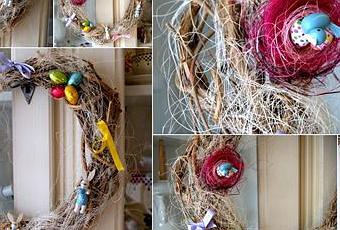 Bois, fibre sisal, ruban et les 2 petits oeufs dans le nid sont en plastiroc