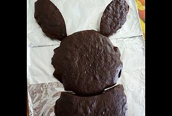 Vous en mettez un au milieu sans lui faire de mal, ce sera la tête. Par contre, l'autre va se faire charcuter un peu: vous découpez de façon symétrique sur chaque côté les deux oreilles, en faisant des arcs de cercles en miroir par rapport aux bords du gâteau. Le milieu restant servira de noeud papillon (bah oui lapinou d'anniversaire = lapinou classe!). Une fois les choses en place comme sur la photo, nous pouvons passer au glaçage.