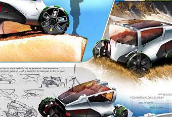 Un véhicule zéro émission imaginé pour évoluer dans des milieux escarpés. Il est doté de panneaux solaires lui permettant d’assurer la recharge de ses batteries lors de ces excursions; et d’une petite éolienne dissimulée sur le toit qui prendra le relai une fois le véhicule à l’arrêt et/ou en l’absence de soleil …