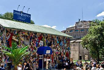 Cordes de guitare, boites de conserves, chaussettes et appareils photos usagés, non vous ne rêvez pas, vous êtes bien allongé dans une chambre du Save the Beach Hôtel, premier hôtel au monde fabriqué à partir de douze tonnes de déchets ramassées sur les plages. L’artiste et activiste allemand HA Schult a installé à Rome, sur les bords du Tibre, son cri d’alarme en faveur de la protection du littoral. Première cliente de cet hôtel pas comme les autres, le top model Helena Christensen s’associe à la provocation. Cinq chambres et une réception conçues sur un mode itinérant histoire de mobiliser le plus de monde possible. Schult veut montrer que l’avenir des plages est compromis. Pollutions et gaspillages sont pointés du doigt. Une démarche originale pour réveiller les consciences des voyageurs à la veille des vacances.