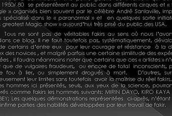 Si vous êtes en possessions de documents sur les fakirs, connus ou moins connus, toutes informations sera fortements appréciées afin de faire de ce blog une référence sur ce sujet. S'abstenir tout de même d'envoyer des photos du "beau frère" avec un piercing dans les sourcils ..merci.