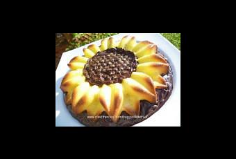 Pourquoi un gâteau avec deux couleurs de pâte? Tout simplement parce que je voulais utiliser le le gros moule Tournesol que j’ai reçu tout récemment dans ma boutique Aux arts de la table.