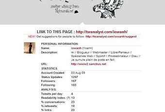 Des statistiques, des analyses, des chiffres, des pourcentages, … pour votre compte Twitter, vous en rêviez ? Twanalyst l’a réalisé pour vous ! Découvrez donc quelle est votre personnalité et vos habitudes sur le service de micro-blogging Twitter. Pour ce faire rendez vous sur Twanalyst, renseignez votre pseudo utilisé sur Twitter et appuyez sur Enter. Le tour est joué ;)