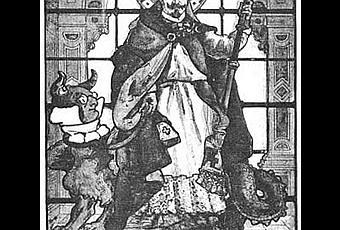 Dans les gemmes d'un vitrail signé Toché, Laurent Tailhade, vêtu d'ornements épiscopaux, foule aux pieds le Mufle dracontisome et courbe cet affreux ennemi sous l'étole vengeresse