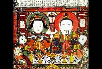Le Dieu du Foyer et sa femme ont leur image dans toutes les maisons ; ce n’est pas une statue, mais un simple dessin grossièrement colorié où le dieu est figuré ordinairement comme un vieillard à barbe blanche, en costume de mandarin, assis sur un fauteuil ; à côté de lui, sa femme, debout, donne à manger aux six animaux domestiques : cheval, boeuf, porc, mouton, chien,