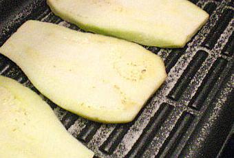 Pendant ce temps mettez votre grille en fonte à chauffer , il doit être très , très chaud (faites attention de ne pas vous brûler) . Jetez dessus une bonne pincée de sel fin , faites cuire les tranches d'aubergines sur les deux faces .