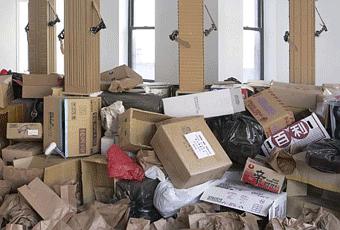 Dans un registre beaucoup plus plastique qu’architectural, l’œuvre Nothing stop a newyorker de Malachi Farrell m’a envoutée. Un amoncellement de cartons et de plastiques de rebus d’où émergent cinq gratte-ciel eux-mêmes fabriqués en carton. Ces immeubles à taille humaine sont pourvus de bras métalliques articulés, des voix probablement radiophoniques, se font entendre et guident leur mouvement. Un rythme entraînant, proche du cours de fitness, nous donne l’impression d’être sur un trottoir de la grosse pomme en train de courir de son 8è à son 9è rendez-vous de la journée.