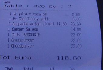 La carte varie légèrement d’une année à l’autre, pour les choix, mais les prix augmentent honteusement (cf. la version 2009, ici et là). Le club sandwich, maintenant servi avec des frites et de la salade, passe de 16 à 20€, le cheeseburger prend un euro à 22€, le gaspacho change de formule et passe de 9 à11,4€ (alors qu’il a bénéficié de la baisse de la TVA), le tartare mont de 117 à 20€. Ok, certains plats n’ont pas bougé (niveau prix), quelques desserts à l’intitulé à peu près constant ont baissé, mais la tendance est plutôt à la hausse. Je suis d’accord pour payer plus un service ou la qualité en plus, mais pas pour financer la nouvelle voiture du patron!
