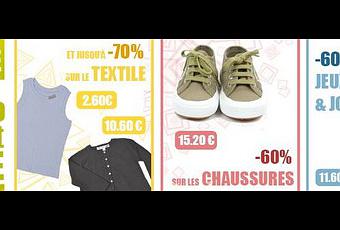 Jusqu'à -70% sur la mode. En boutique, beaucoup d'unis, quelques imprimés fleuris, des bodies et T-shirts à message. Les marques disponibles sont Gabble & Wolsh, Tendre à Croquer, La Nuit cé tous les Jours, Gkero.