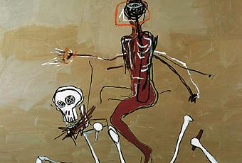 Au juste, je ne pourrai pas vous dire pourquoi cette toile de Jean-Michel Basquiat "Riding with Death", peinte en 1988, me ramène à la Pietà de Villeneuve-lès-Avignon. Bien évidemment, vous allez me dire qu'il y a le fond doré qui renvoie d'ailleurs à ses premières œuvres comme "Cadillac Moon" et qui lui