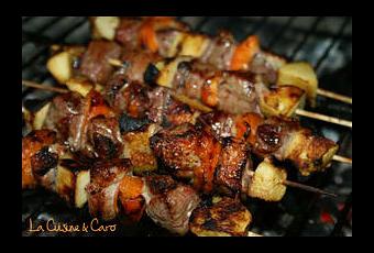 2. Intercaler des morceaux de canards, pommes et abricots sur un pique à brochette.