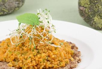 - Décorer avec l'alfalfa et les feuilles aromatiques. Servir aussitôt.