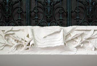 Il s'agit d'un emblème d'architecte. On y voit un plan déroulé, portant un plan très schématisé, entrecroisé d'un compas en partie cassé, avec, en arrière-plan, une équerre, un tire-ligne, un porte-mine, deux rameaux de laurier. Un autre élément, à côté de l'équerre et passant autrefois par dessus le plan enroulé, est aujourd'hui trop endommagé pour être identifié avec certitude ; peut-être s'agissait-il d'un élément végétal et j'inclinerais alors à penser qu'il s'agissait d'une fleur, probablement une pensée — dont nous avons vu par ailleurs, à propos d'une tombe d'architecte à Tours, qu'il s'agissait à la fin du XIXe siècle d'un emblème de l'architecte.
