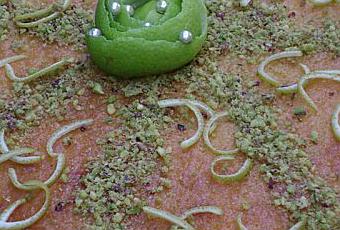Je l'ai décoré de pistaches moulues, de zestes de citron coupés au couteau, d'une peua de citron pelée à l'économe et roulée en forme de fleur et de quelques boules argentées.