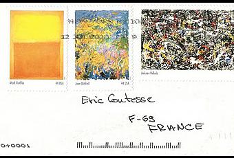 Dans un article écrit sur ce blog le 10 juin 2010, je publiais deux lettres affranchies avec 3 timbres faisant partie d'une très jolie feuille (10 timbres autocollants), émise le 11 mars 2010, reproduisant des oeuvres majeures de grands peintres expressionnistes abstraits américains.
