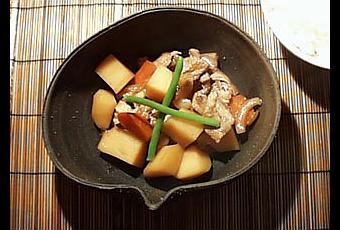 Faire revenir les oignons avec une cuillère à soupe d'huile puis le porc. Il faut que le porc soit colorés ainsi que les pommes de terre.