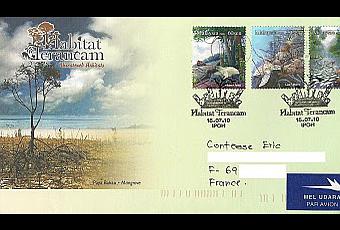 These three new stamps, very successful, are devoted to different threatened habitats for wildlife living in Malaysia, particularly in forest, sea, river banks and in mangrove swamps (picture on the left on the envelope).